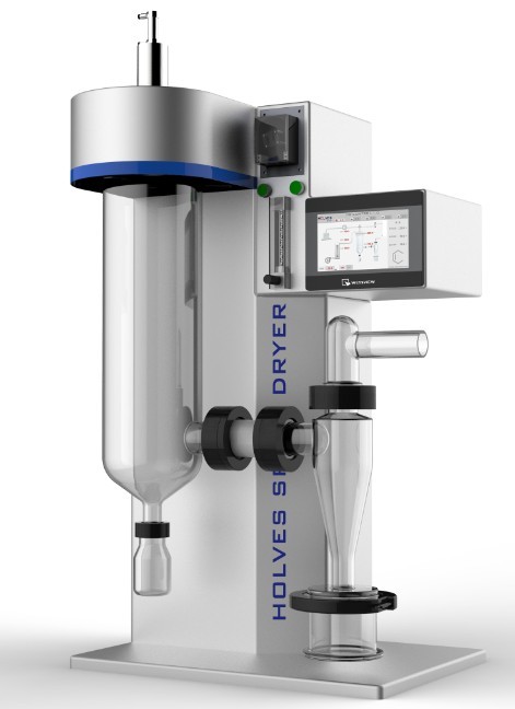 实验室小型喷雾干燥是快速干燥液态物料的一种干燥方法,在干燥室中将液体物料经雾化后,在与热空气的接触中,水分瞬间汽化,即得到干燥产品,该法能直接使溶液、乳浊液干燥成粉状或颗粒状制品,可省去蒸发、浓缩、粉碎等工序,且得到的颗粒分布均匀。