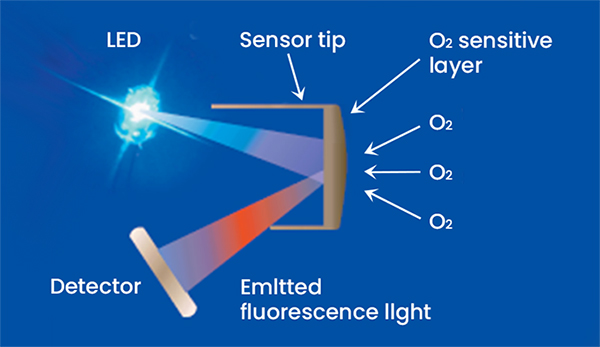 光学溶氧电极采用的是基于物理学中特定物质对活性荧光的猝熄原理。传感器的设计是通过一个发光二极管(LED)发出的蓝光照射在荧光帽内表面的荧光物质上,特定的发光体被蓝光激发后会发生冷光现象(红光),通过检测红光与蓝光之间的相位差,并与内部标定值比对,便可计算出氧浓度最后再经过温度和气压自动补偿输出最终值。