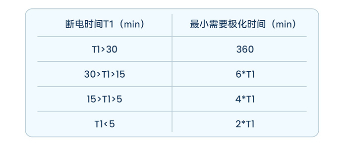 ③ 变送器断电或电极与电缆线断开,最小极化时间见下表。