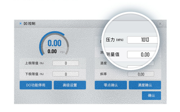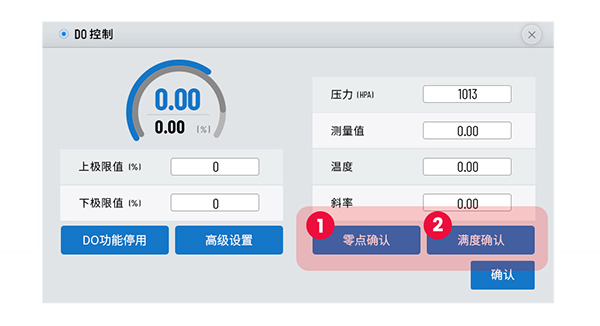 将电极接通电源后,先放入无氧环境中,待读数稳定后点击“零点确认”,再将电极放入纯氧环境中,待读数稳定后点击“满度确认”,弹出窗口“DO电极OK”即表示校准完成。