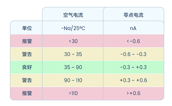 以纯度99.995%的氮气为校准介质进行校准后,参考极谱式溶氧电极电流信号表中零点电流的标准,判断DO电极的零点是否正常。