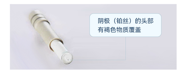 这种情况下,将内电极的头部对着光源观察阴极,可以看到阴极表面显露出黑色。可使用标号1000目以上的砂纸在铂丝头部轻轻打磨数次,至铂丝表面发亮即可。切不可过度打磨,否则会使内电极头部受损。