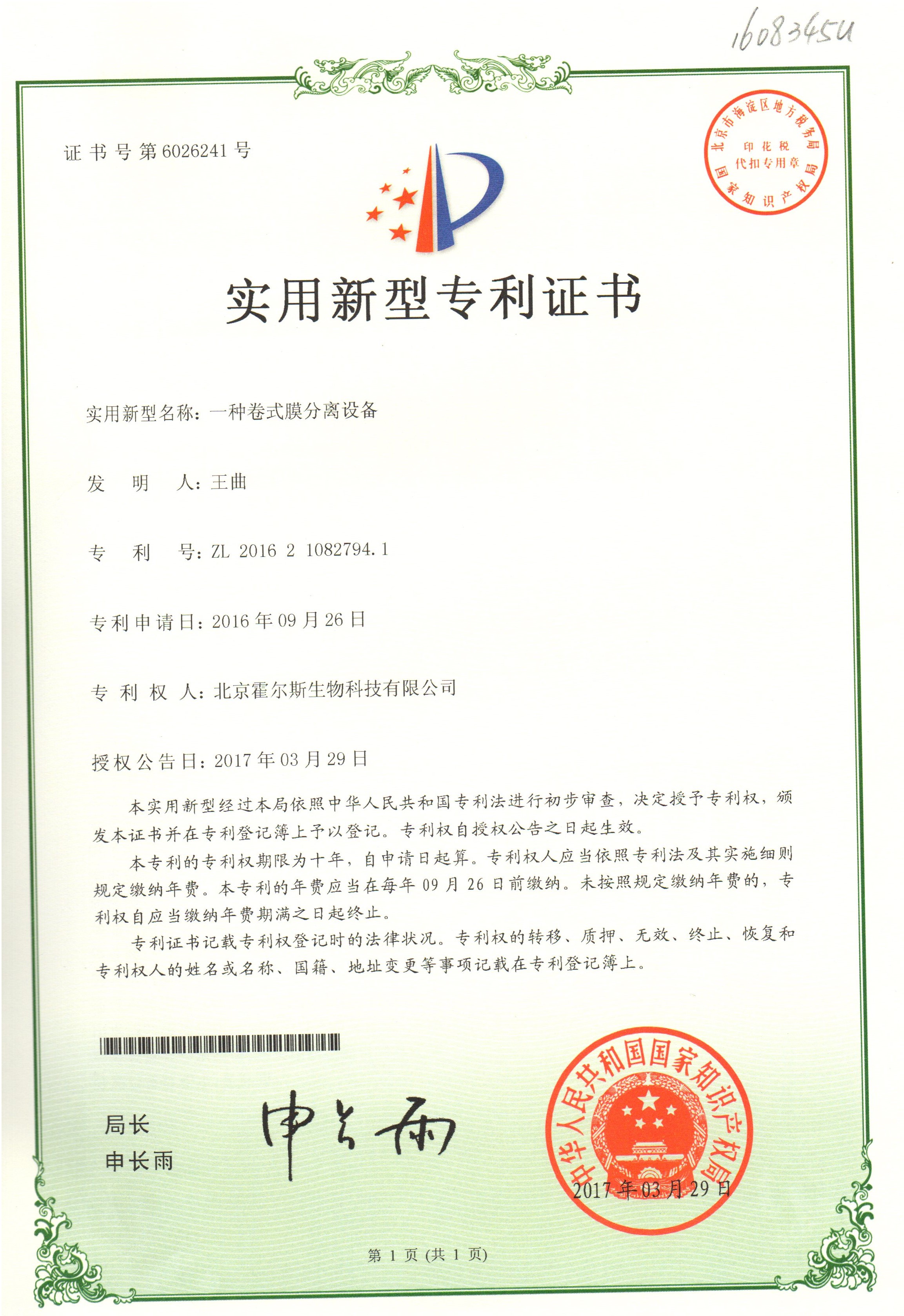jinnianhui官网获得膜分离设备的专利