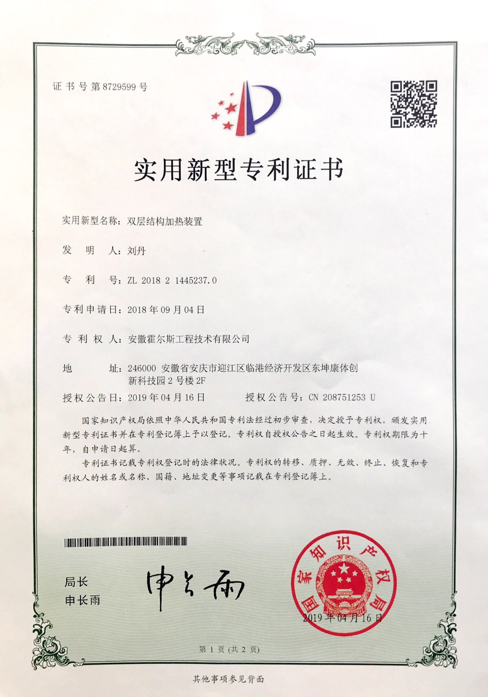 双层结构加热设计增加了空气在加热器中通过的时间,使得发热管热量更好传递给空气,保证了对空气温度的要求,发热管在发热过程中,热能有效的被加热外管和加热內管吸收,在空气通过时,提高了热接触面积,提高了热转化效率,同时有提高了能效利用率。近期,该项设计已成功获得国家专利证书,这是jinnianhui官网公司坚持自主研发的又一新的成果。